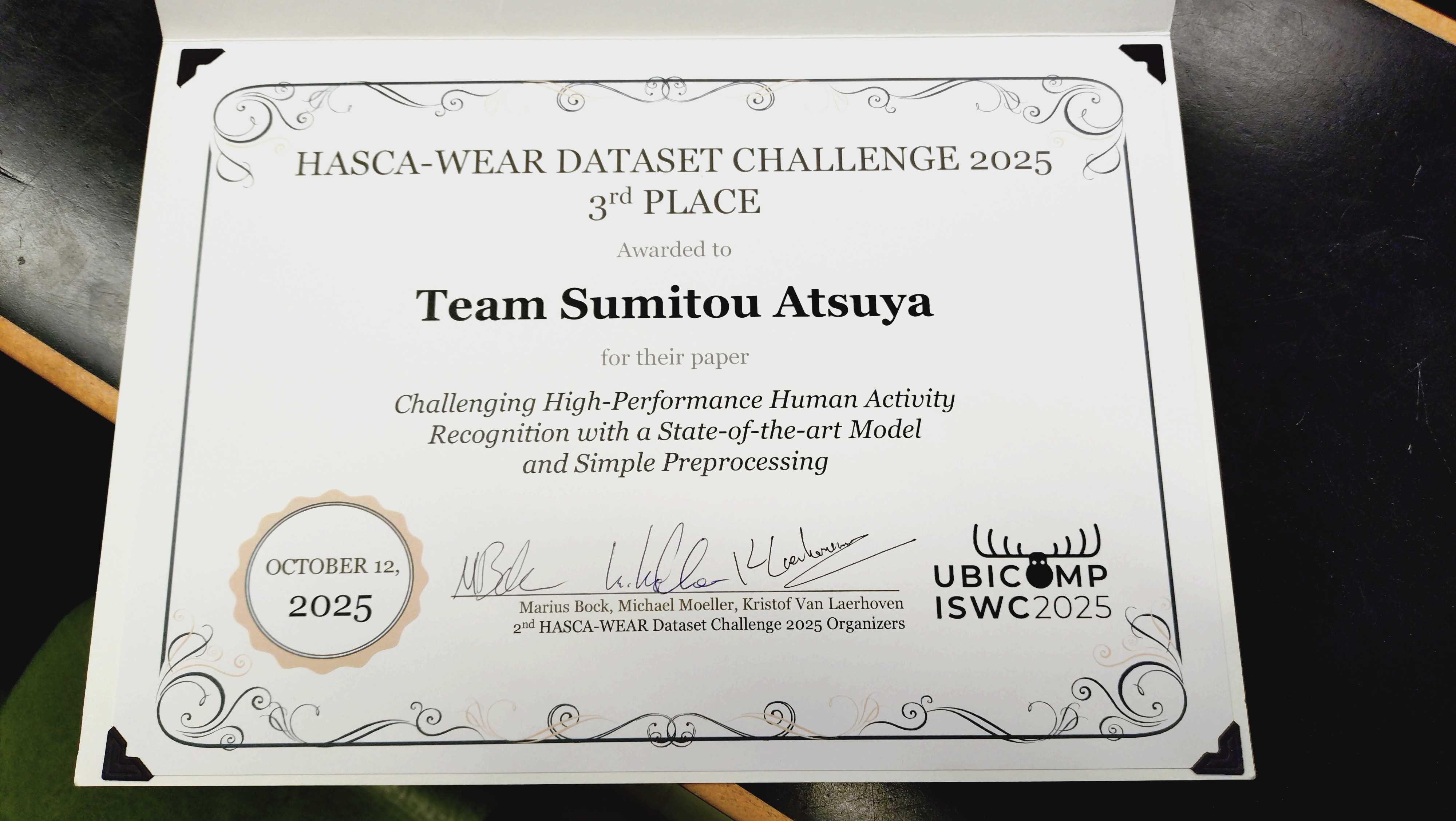 WEAR challenge organizersよりHASCA-WEAR Dataset Challenge 2025: 3rd placeを受賞しました。(知能システム学専攻 Atsuya Sumito B4)