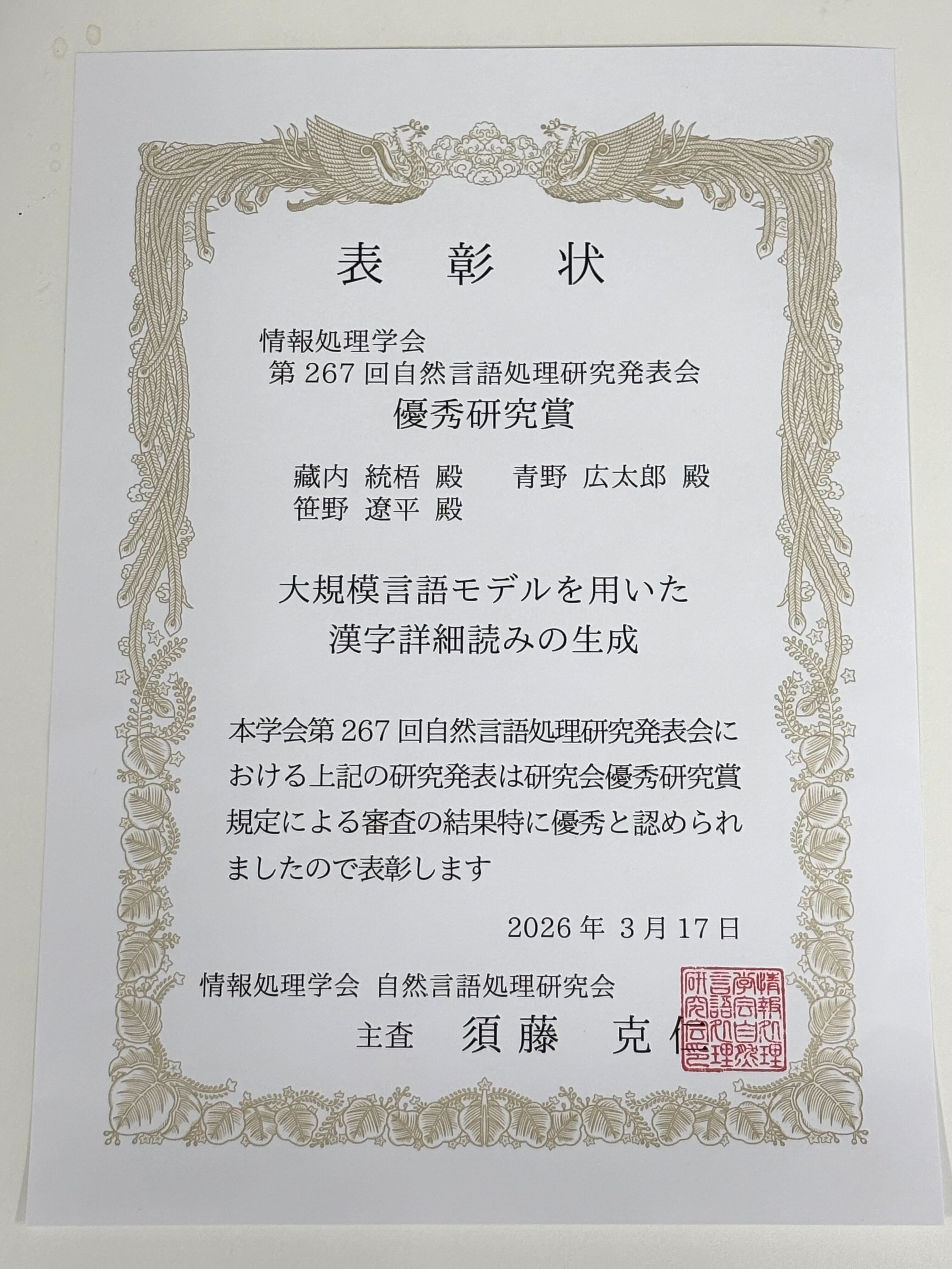 情報処理学会 自然言語処理研究会より優秀研究賞を受賞しました。(藏内統梧 B4・知能システム学専攻 青野広太郎 M修了・価値創造研究センター 笹野遼平 准教授)