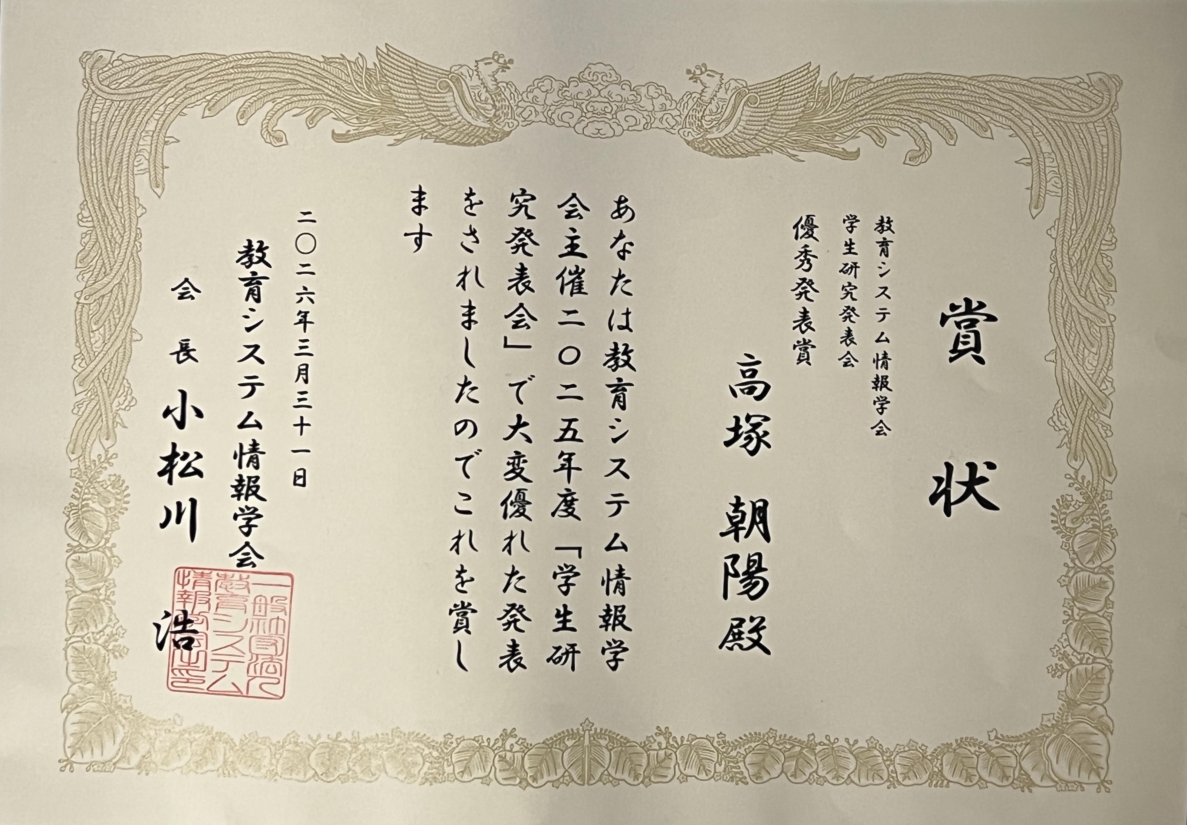 教育システム情報学会より教育システム情報学会学生研究発表会優秀発表賞を受賞しました。(複雑系科学専攻 高塚朝陽 M1)